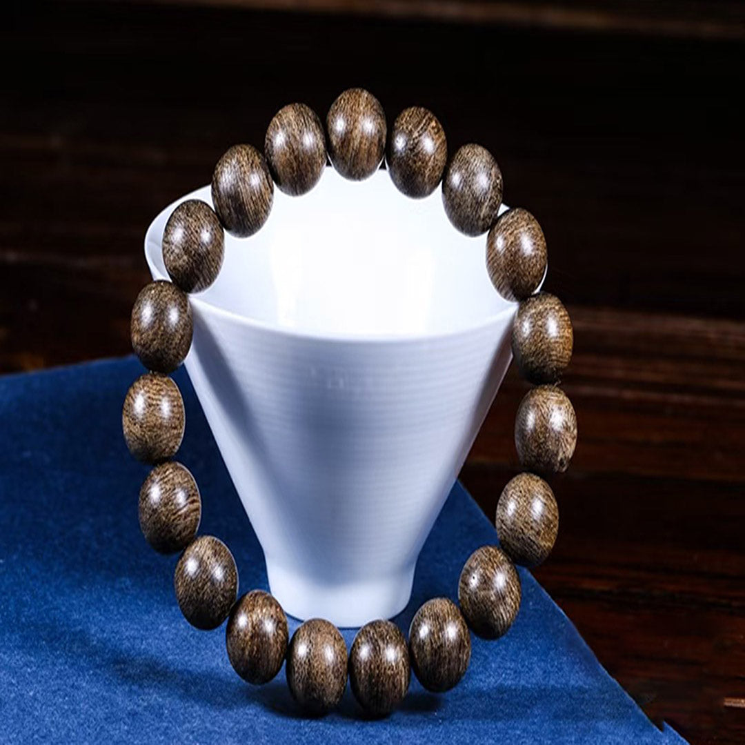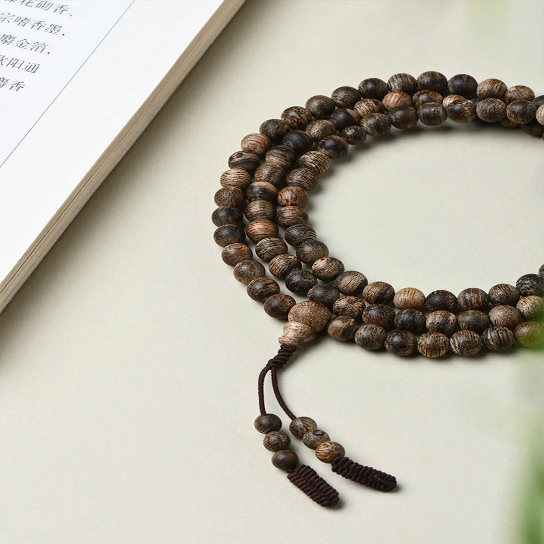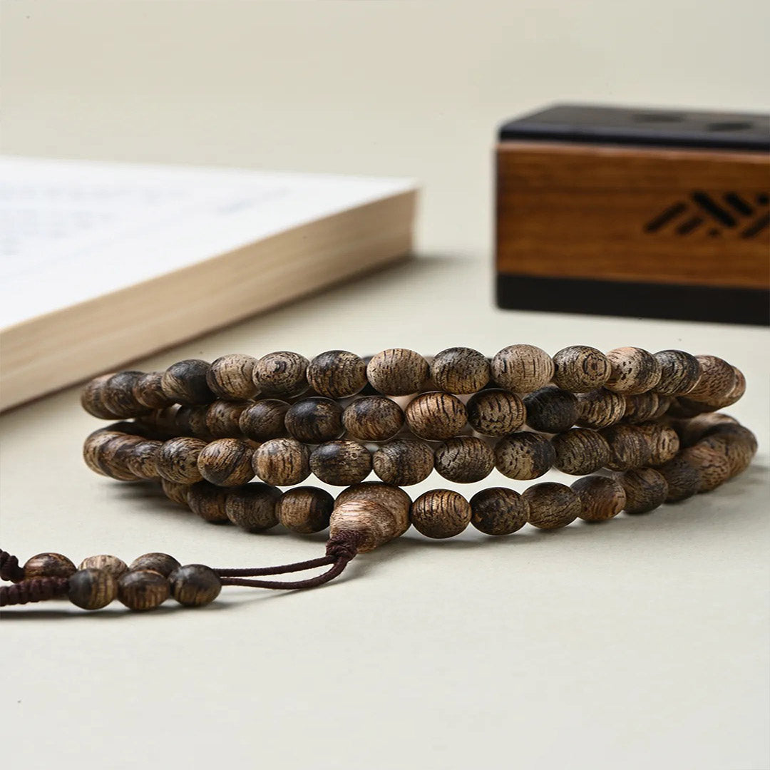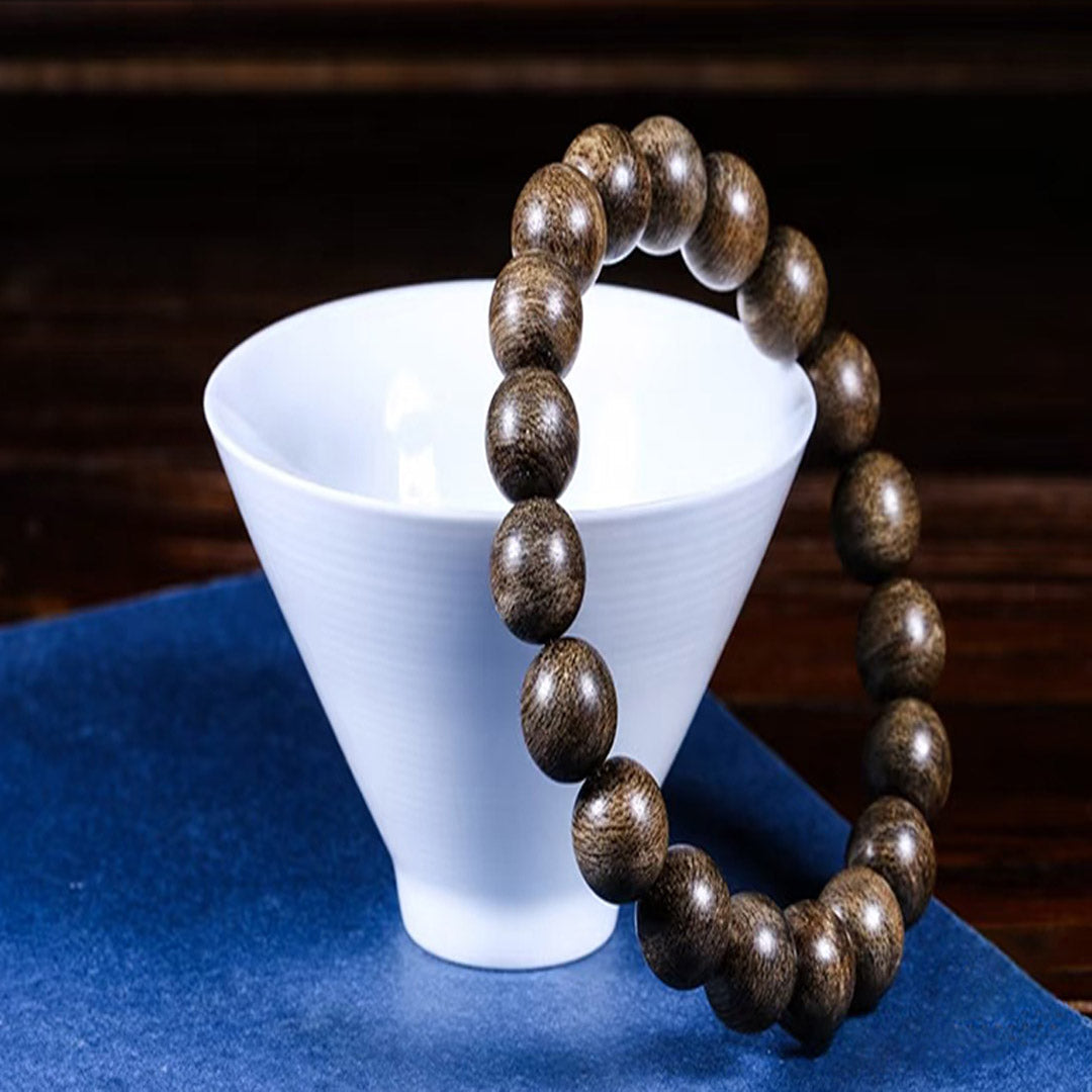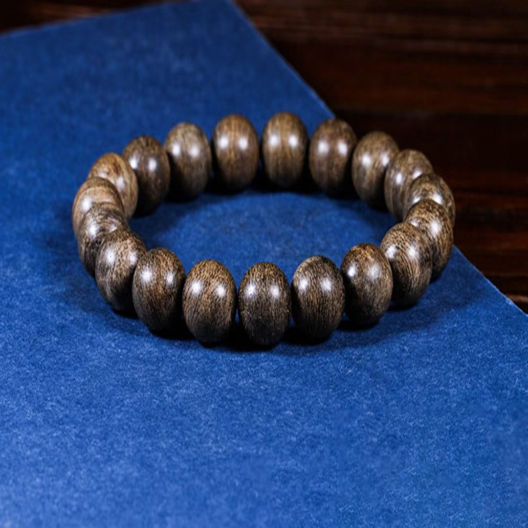 The agarwood bead bracelet serves not only as an elegant ornament but also as a natural guardian of physical-mental wellness, offering multifaceted benefits through its unique aromatherapy and spiritual practice properties. Physiologically, the sesquiterpenes (e.g., agarol) rich in agarwood are gradually released by body heat, traveling via olfactory nerves to the limbic system to effectively reduce cortisol levels, alleviating anxiety and insomnia; its natural antibacterial and anti-inflammatory properties help purify surrounding air while minimizing respiratory irritation, and the sustained mild warmth at the wrist pulse point enhances blood circulation to address energy stagnation. Psychologically, its subtle fragrance demonstrates remarkable calming effects, swiftly stabilizing emotional fluctuations while improving focus and decision-making clarity—particularly beneficial for high-stress individuals. The 108-bead cyclic design facilitates Buddhist mantra recitation or modern mindfulness practice, using tactile feedback from bead-rolling to establish mind-body connection and interrupt negative thought patterns. From an energy medicine perspective, agarwood's status as "king of fragrances" enables its vibrational frequency to harmonize with human biofields, balancing chakra energies—especially crown and third-eye chakras—to enhance intuition and spiritual awareness. Long-term wearers often experience deeper transformation: the gradually formed patina on beads records personal energy imprints, while the wood's aromatic evolution (from crisp to mellow) mirrors life's spiritual journey, helping maintain inner equilibrium amidst societal chaos to achieve holistic harmony.