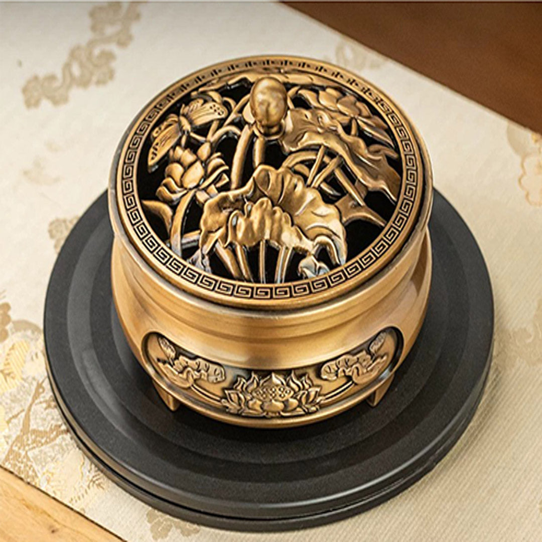 Designed for agarwood appreciation, this burner combines purple copper and ebony wood. The copper body, cast through lost-wax technique, features carved cloud-dragon motifs, while the wooden base houses a brass ash tray for charcoal or electric heating. The perforated lotus-lid ensures gradual fragrance diffusion, with embedded raw agarwood slices releasing woody notes when warmed. Merging traditional ceremony with modern safety, it's a collector-grade piece for connoisseurs.